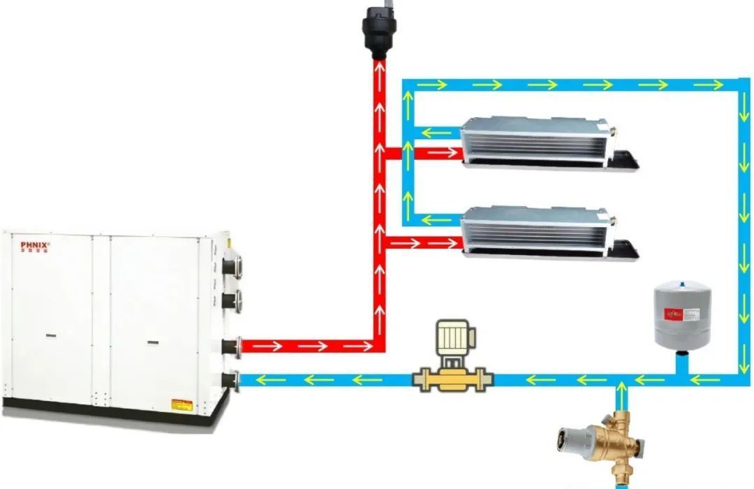 在空调制冷系统中(除直接蒸发式装置外),水通常作为载冷剂承担冷量传递功能,这种介质被称作冷媒水或冷水。其运行流程为:冷媒水首先进入制冷机蒸发器制冷剂进行热交换,吸收热量后通过水泵驱动经管道网络输送至各类空气处理设备;在空气处理环节,冷媒水将冷量释放给待处理的空气,完成降温过程;携带废热的回水则再次通过循环管路和泵组返回蒸发器,形成闭合循环系统。该循环过程通过热力学传递实现了制冷能量在系统内的持续转移。