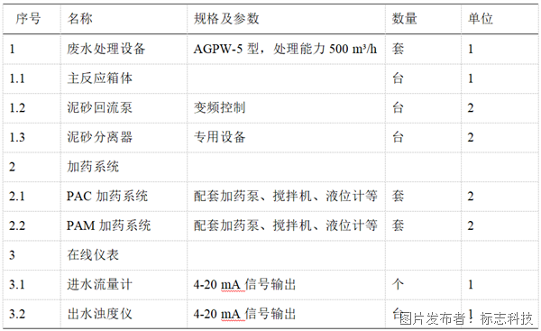 本项目共设置3套重介速沉水处理设备,型号为AGPW-5型,处理能力500 m³/h,单台装机功率37.5 kW。其设备清单及参数见表2。