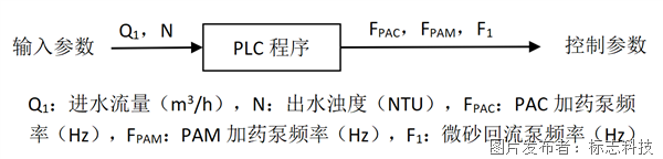 自控系统采用PLC程序控制,如图2所示,采用线性比例PID加药控制方式,其中PAM加药泵和PAC加药泵流量控制采用变频器控制,其加药流量QPAM与QPAC与进水流量Q1和出水浊度N线台微砂回流泵定频满负荷运行,另1台微砂回流泵变频控制,其频率与进水流量Q1和出水浊度N线性关联。当进水流量Q和出水浊度N发生变化时,由进水流量计检测出当前进水量的数值,出水浊度仪检测当前出水浊度数值,各输出一个4-20 mA的标准信号送至PLC系统,PLC系统根据设定的程序,经PID计算后,向PAC、PAM计量泵和微砂回流泵的变频器发出控制信号,将加药泵和微砂回流泵的流量自动调节到合适的值。