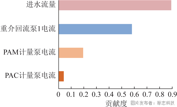 对数据进行探索性分析,了解数据的分布、关系和趋势。通过编制可视化分析图表,找出水质指标与各参数之间的关系。本项目中数据分析的重点是采用人工智能软件确定影响出水浊度的各个因子,并对其贡献值进行分析,其结果见图4。