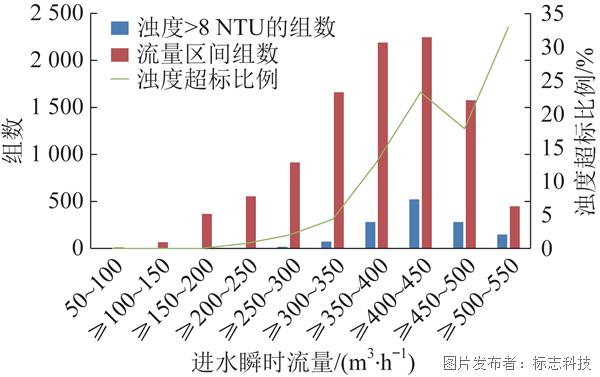 通过数据分析,确定各影响因子对出水浊度的贡献度排序为进水流量>重介回流泵1电流>PAM计量泵电流>PAC计量泵电流。其中进水流量和重介回流泵1电流贡献度远远大于PAM计量泵电流和PAC计量泵电流,这表明进水流量和重介回流泵流量的变化对出水浊度影响最大。图5中对连续20 d、每间隔3 min取一组数据,共约10 000组数据进行分析统计,以进水量每50 m3/h作为一个区间,统计得出当进水量在区间350~500 m3/h时,出水浊度升高的比例均为15%以上。特别是当进水量在400~450 m3/h之间,出水浊度升高的比例达到20%以上。