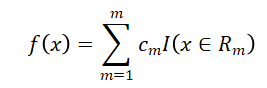 假设将输入空间化为了M个单元,R1,R2…Rm,并且每个单元上都有着一个固定的输出值Cm。则回归树的模型可以表示为: