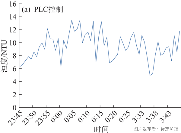 图3为进水流量与出水浊度的对应关系。进水流量波形与出水浊度波形一致性较差,出水浊度不平稳。在PLC控制下,该种情况发生的频率较高。